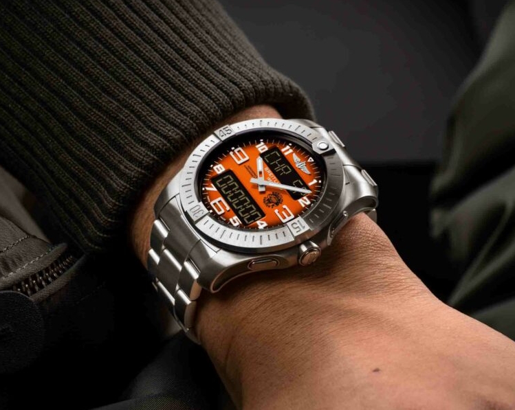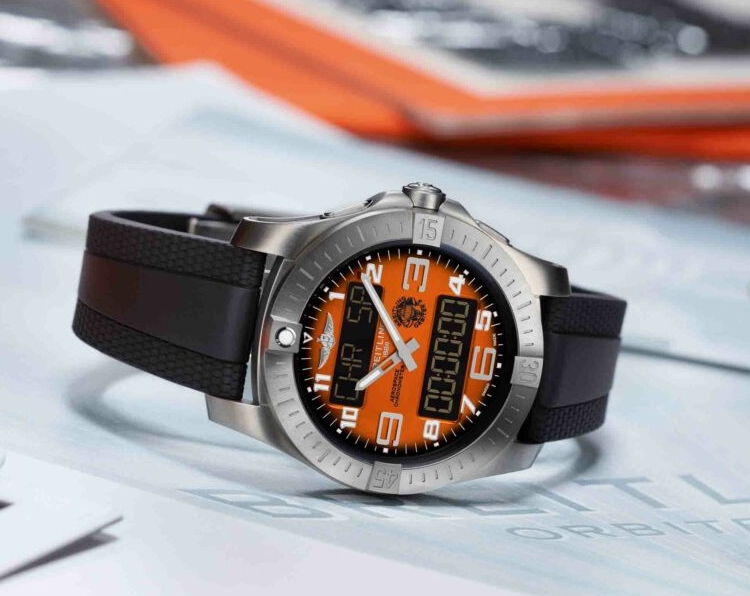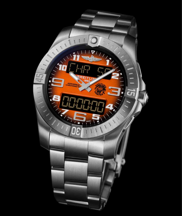 The dial of the new best copy Breitling Aerospace B70 Orbiter watches are finished in a vivid shade of orange with a radial gradient effect that darkens to black towards its outer edge, and it features the collection’s signature layout with a pair of centrally-mounted analog hands, large Arabic numeral hour markers, and two LCD screens that are tasked with displaying the advanced functionality of its internal movement. The color orange was chosen as a nod to the color of the Orbiter 3 capsule that held the two crew members, and if you look at photos taken during the voyage, you will also notice a Breitling Emergency with an orange dial on the wrist of Bertrand Piccard, who piloted the Obiter 3 balloon with Brian Jones on its historic journey around the globe.